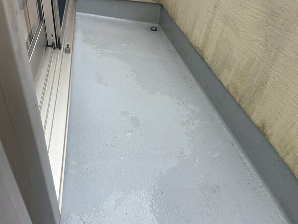 床面には色あせや雨水による跡が見られ、防水層の表面保護であるトップコートの劣化が進んでいる状態でした。バルコニーは雨水の影響を直接受ける場所のため、防水性能が低下すると雨漏りの原因となることもあります。