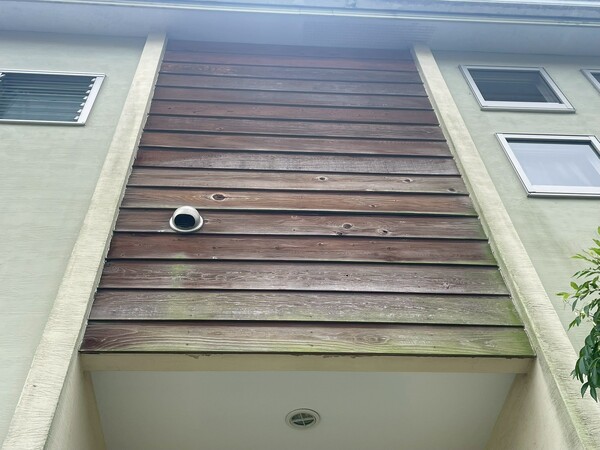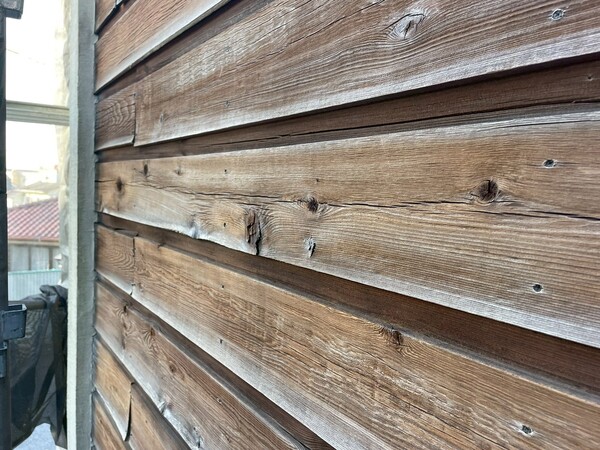 今回の現場では、写真のように木部の外壁部分に色あせや表面の劣化が見られる状態でした。