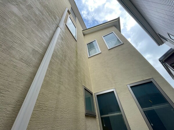 外壁全体にくすみや雨だれによる汚れも見られ、塗膜の防水機能が低下している様子が確認できました。
