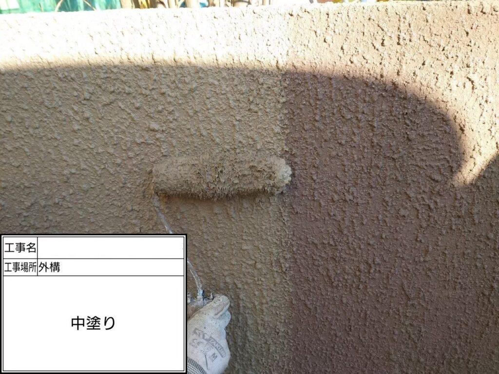 塗膜の厚みを確保しながら、下塗りで整えた下地をなじませ、色を均一に整えていく工程です。