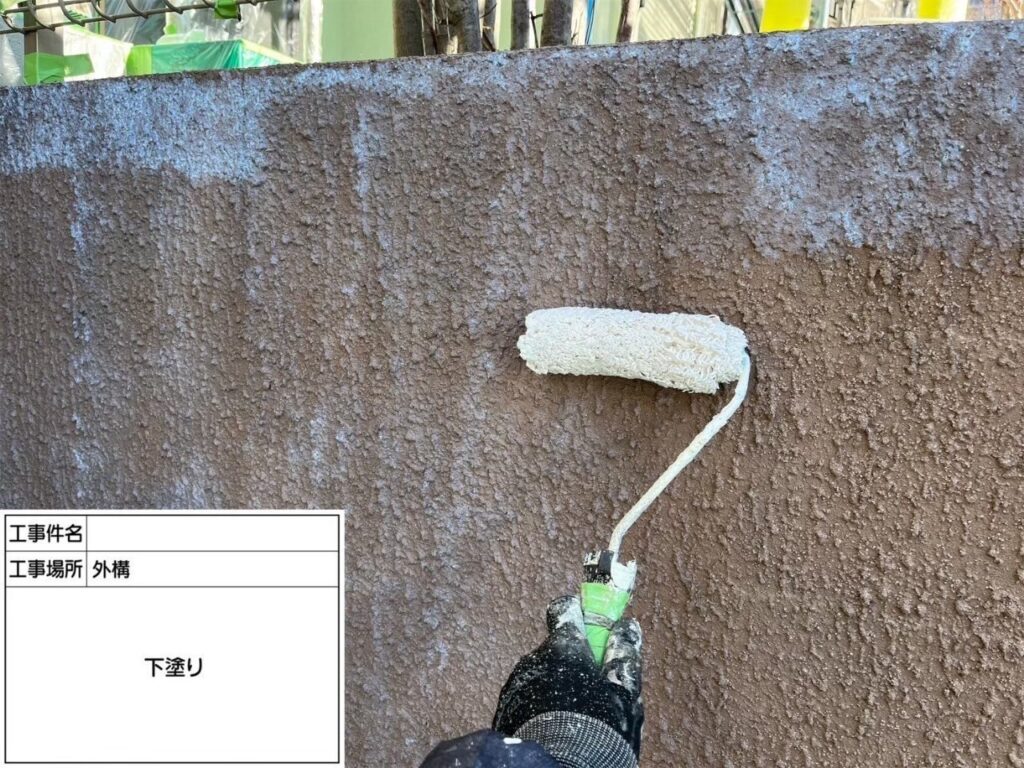 補修では、割れた部分をVカット処理して奥まで補修材を充填し、表面を滑らかに整えてから下塗りを施工します。この工程により、塗料が下地にしっかり密着し、後の中塗り・上塗りがムラなく定着するベースが完成します。